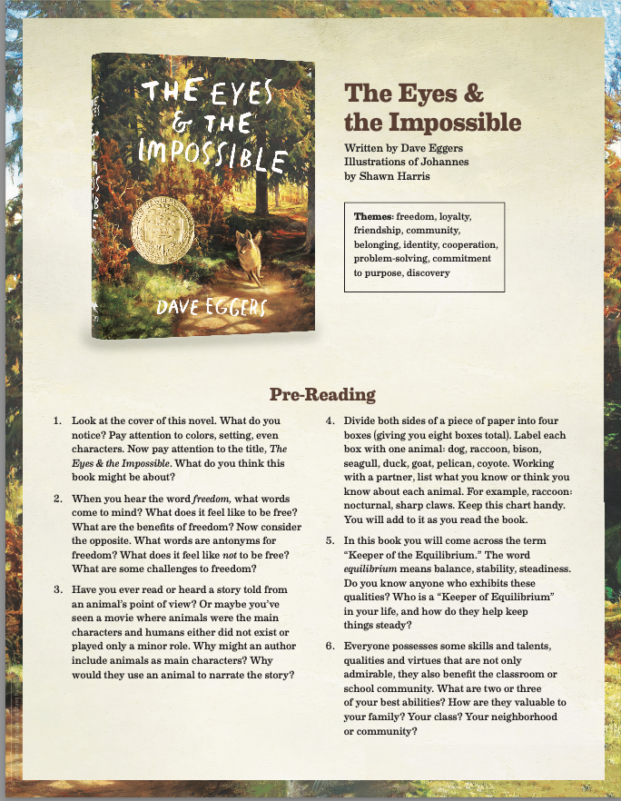 "The themes of friendship, freedom, and teamwork, expressed through beautiful prose, made The Eyes & the Impossible the perfect choice for our Community Book Read. Everyone from TK students to 6th graders, to our adult staff, found a connection to Johannes and his lively collection of friends."